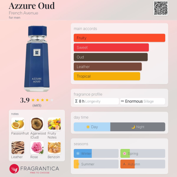 Discover Azzure Aoud by French Avenue, a perfume that embodies the essence of luxury and refinement. This fragrance is a sensory journey that begins with a vibrant opening, where Passion Fruit and fruity notes blend with the delicacy of Rose and the intriguing spiciness of Saffron. At the heart of the composition, the iconic Oud intertwines with the warm sweetness of Benzoin and the earthy depth of Patchouli, creating a rich and enveloping accord.