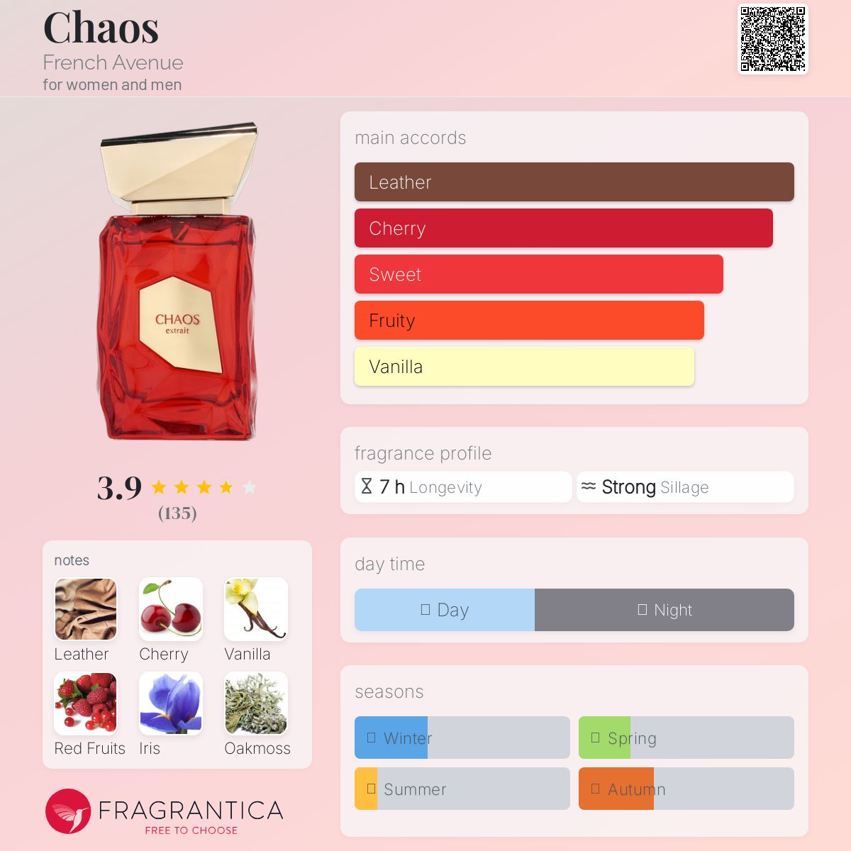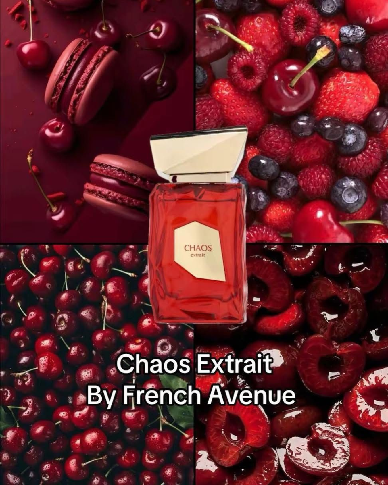 French Avenue Chaos Extrait (100ml) is a bold, unisex leather-fruity fragrance known for its rich blend of sweet cherry and red fruits opening, an elegant iris heart, and a deep base of vanilla, moss, and leather, creating a sensual, long-lasting scent perfect for evening wear or cooler seasons, inspired by complex scents like Maison Crivelli Cuir InfraRouge, offering both sweetness and depth.