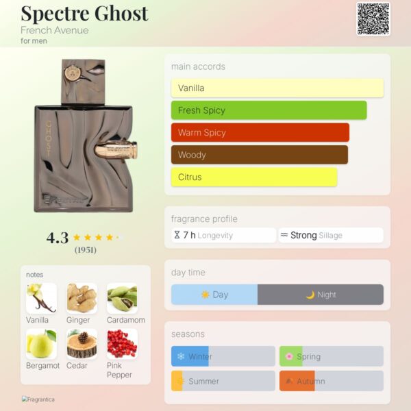 Spectre Ghost by French Avenue perfume is not just a perfume, it is an olfactory statement. It is an enigmatic combination of warm spices, unexpected fruits, romantic floral notes and a sensual gourmand base. It’s a perfect unisex fragrance for those who want to feel unique, daring and full of mystery.