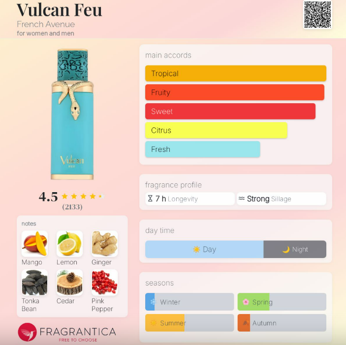 Vulcan Feu is more than just a fragrance—it’s a fiery experience. Designed for both men and women, this unique scent opens with a spark of vibrant notes that evolve into a warm, smoldering blend. Whether you’re stepping into a boardroom or a night out, Vulcan Feu leaves a lasting impression that speaks of strength, mystery, and confidence.