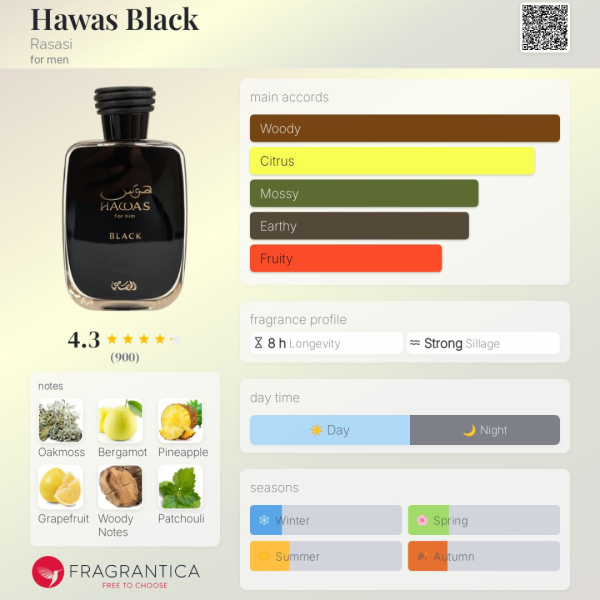 Hawas Black by Rasasi is a masculine fragrance that combines freshness, warmth and elegance in a scent designed to stand out. This 100ml Eau de Parfum is perfect for modern men looking for an intense, comfortable and long-lasting perfume.