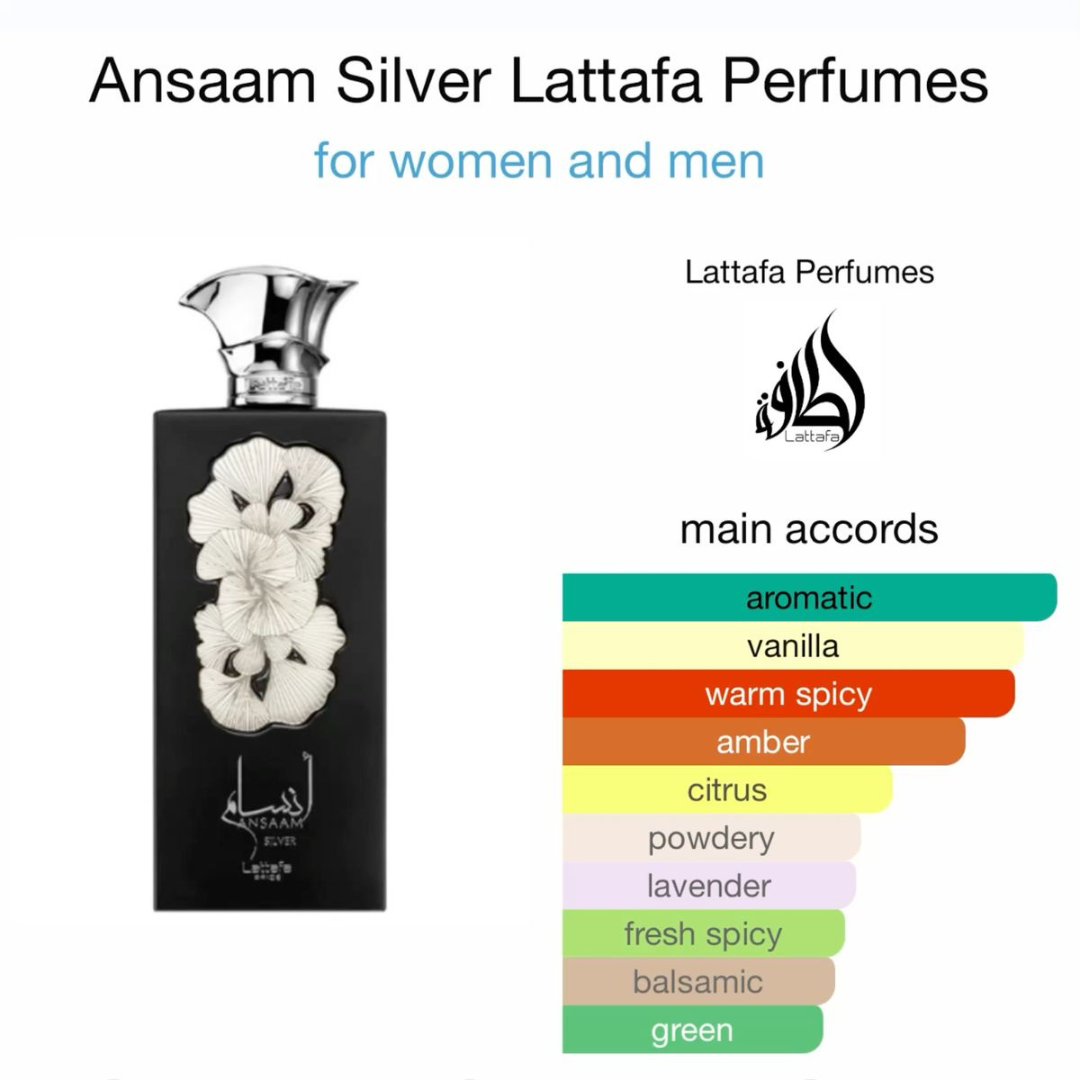 Ansaam Silver by Lattafa Perfumes is a fragrance for women and men. This is a new fragrance. Ansaam Silver was launched in 2022. Top notes are Cardamom and Bergamot; middle notes are Lavender and Davana; base notes are Vanilla, Amber and Patchouli.