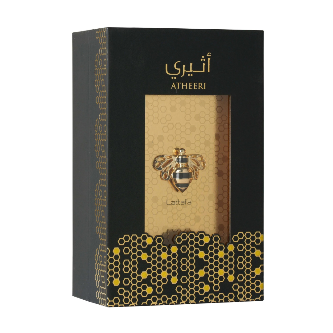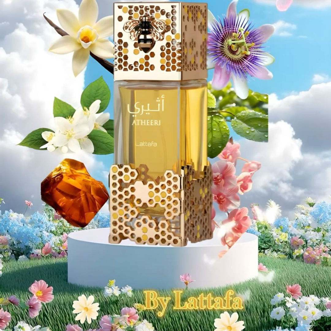Atheeri is a soft and ethereal floral gourmand fragrance for everyone from the house of Lattafa. It captures the essence of golden sunlight filtering through a serene garden, where the freshness of morning dew mingles with the intoxicating sweetness of passionflower. At its heart, a delicate bouquet of orchid and jasmine evokes a sense of timeless elegance. The fragrance settles into a sensual embrace of creamy vanilla and rich Amberwood, leaving behind a soft yet captivating trail of warmth and allure.