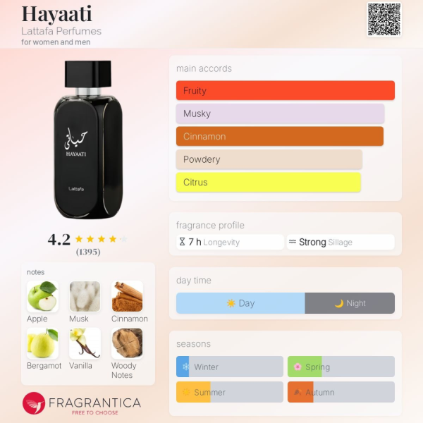 Hayaati is a strong, elegant perfume. It suits any occasion. It smells similar to designer brands like Paco Rabanne Invictus and Rasasi Hawas at a lower price.