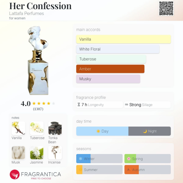 Lattafa Her Confession Eau De Parfum Spray is a mesmerizing fragrance for Women that beautifully balances warmth, mystery, and elegance. It begins with a captivating blend of cinnamon and mystical accords, creating an intriguing and inviting opening. As the scent unfolds, a luxurious heart of jasmine, tuberose, and incense emerges, adding floral richness and depth, while mahanial enhances the fragrance with a subtle yet enchanting touch. The base notes of tonka beans, musk, and vanilla provide a sensual and long-lasting foundation, leaving a trail of warmth and allure. Her Confession is the perfect scent for the modern woman who exudes confidence, charm, and a hint of mystery, making it ideal for any occasion.