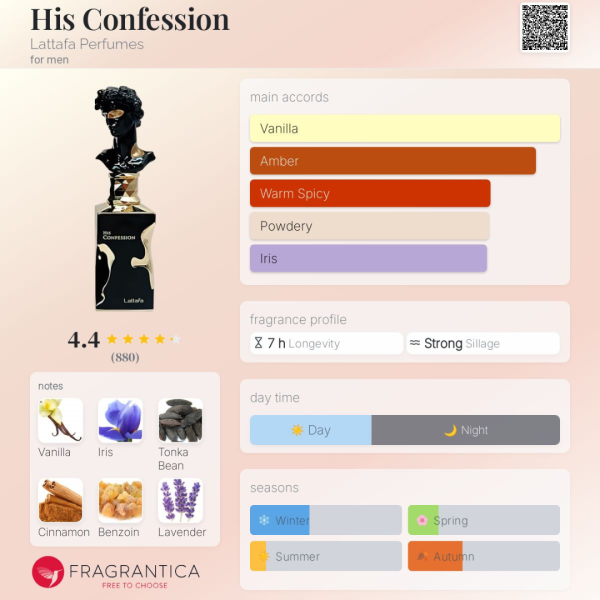 Lattafa His Confession Eau De Parfum Spray for Men is a bold and captivating fragrance that embodies modern masculinity. It opens with a refreshing and spicy blend of mandarin, cinnamon, and lavender, creating an invigorating introduction that immediately commands attention. As the fragrance develops, it reveals a rich heart of iris, cypress, and benzoin, adding depth and sophistication. The composition is grounded by a warm and sensual base of vanilla, tonka beans, patchouli, cedarwood, incense, and amber, leaving a lasting and memorable impression. His Confession combines freshness with warmth, making it versatile for any occasion, whether day or night. This fragrance is the perfect choice for men who seek to exude confidence, elegance, and a touch of mystery, ensuring they make a statement wherever they go.