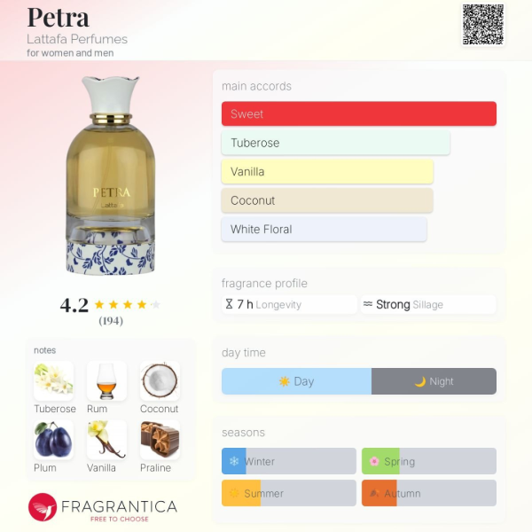 Inspired by the Greek word ‘πέτρα’ (pronounced ‘petra’), meaning ‘stone’ or ‘rock’, Petra by Lattafa is more than just a fragrance — it’s a transformation. Inspired by the laid-back luxury of the Mediterranean, Petra captures that fleeting moment of summer at its peak and petrafies it. The result is a scent that freezes warmth, florals, and memories into something eternal. As the scent unfolds, the delicate floral pattern begins its quiet conquest, petrafying each ingredient in place like nature turned to art. You are not just wearing a fragrance; you are being transformed by it—softly, completely, forever. Get petrafied in a Mediterranean summer.