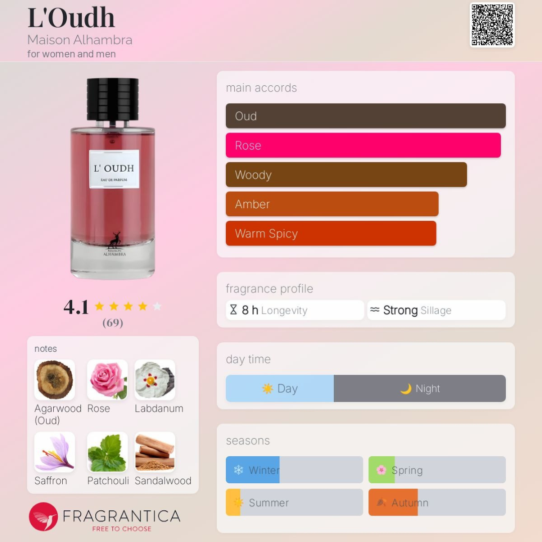 L`Oud is like opening the doors of an Oriental palace with ochre walls and being struck by its fragrance. The smoky scent of burning wood blends with that of sweet floral water on washed hands. That’s the scent of this smooth atmosphere, where rose, frankincense and resin linger. The perfume is velvety and sensual, like the roses of the Orient.