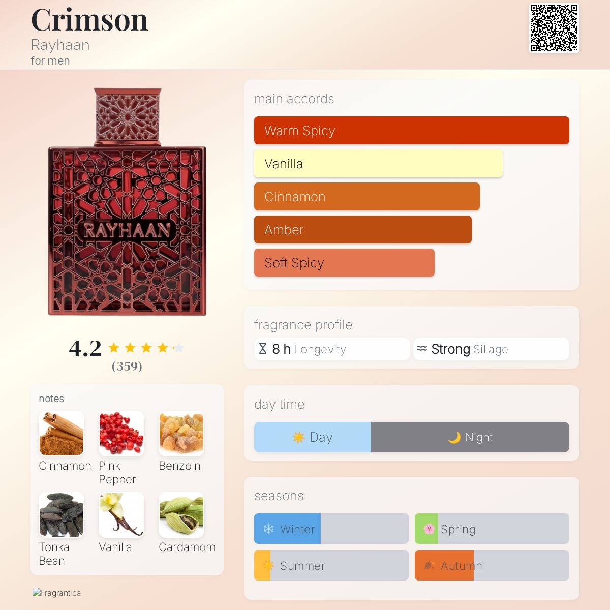 Rayhaan Crimson – A Bold Expression of Power and Elegance. A fragrance that commands attention, Rayhaan Crimson exudes warmth, depth, and undeniable allure. Its rich, spicy character unfolds into a refined blend of sensuality and strength, leaving behind an irresistible, long-lasting trail. Perfect for those who embrace confidence and sophistication, Crimson is more than a scent—it’s a statement.