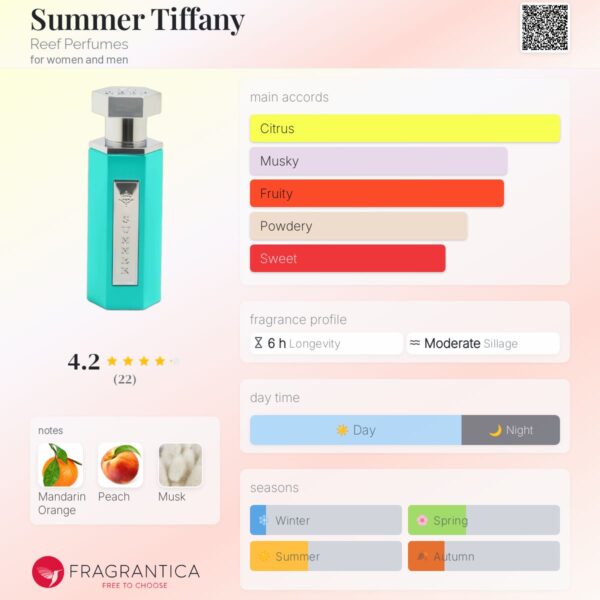 Finally, with the base of soft and warm musk, the scent of Summer Tiffany will stay with you all day long-turning heads and capturing admiration wherever you go.
