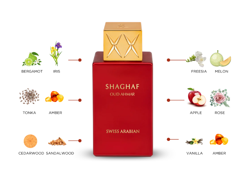 Shaghaf Oud Ahmar is a warm amber gourmand fragrance that silently speaks of luxury and opulence. Make a sparkling entrance with bergamot and dawn-fresh green notes. A mouth-watering heart of melon, apple and pineapple is ripe with carefree abundance. Your lingering signature is a sumptuous breeze of golden vanilla, exquisite woods and gentle powdery musks as Shaghaf Oud Ahmar leaves the unique memory of you in its wake.